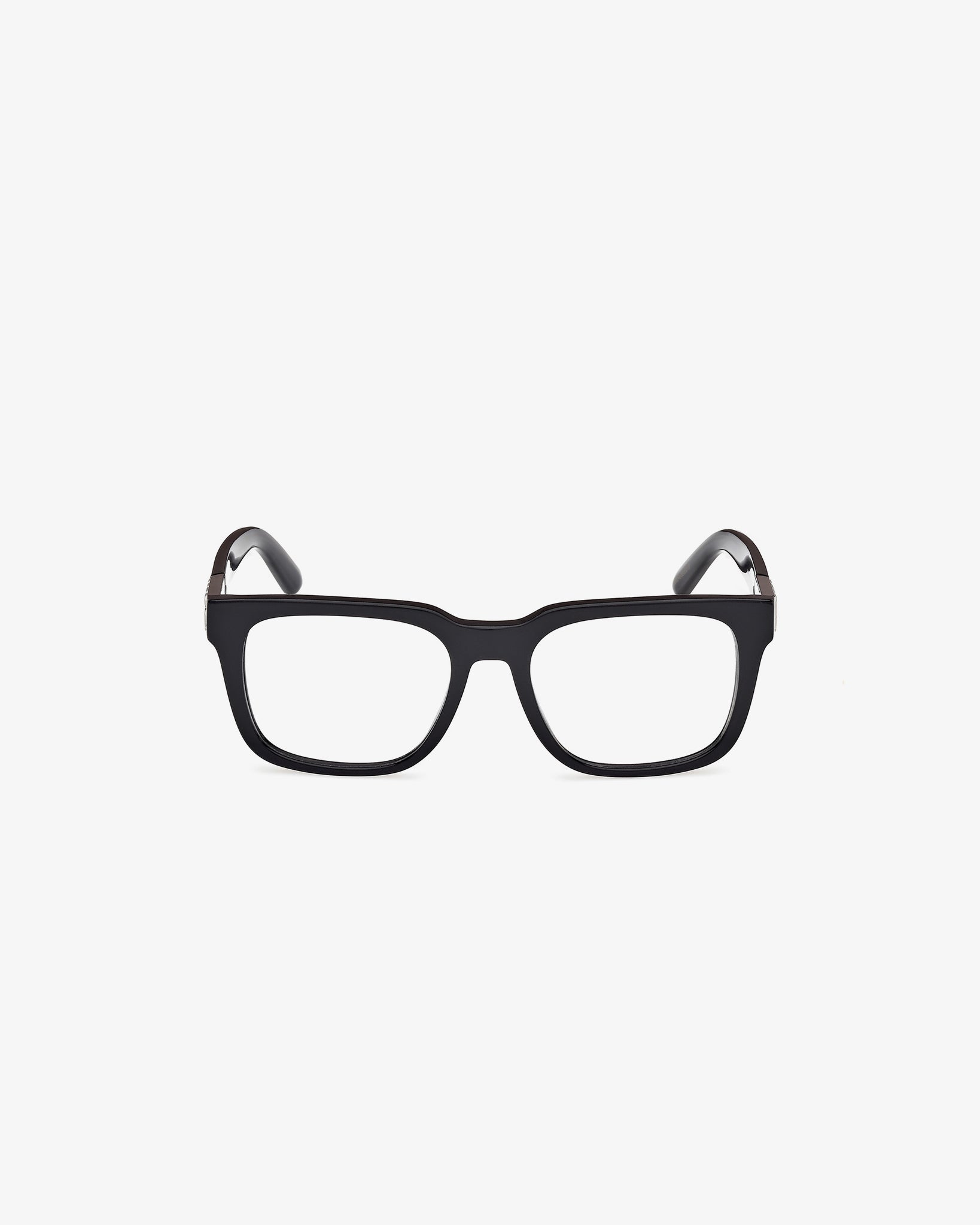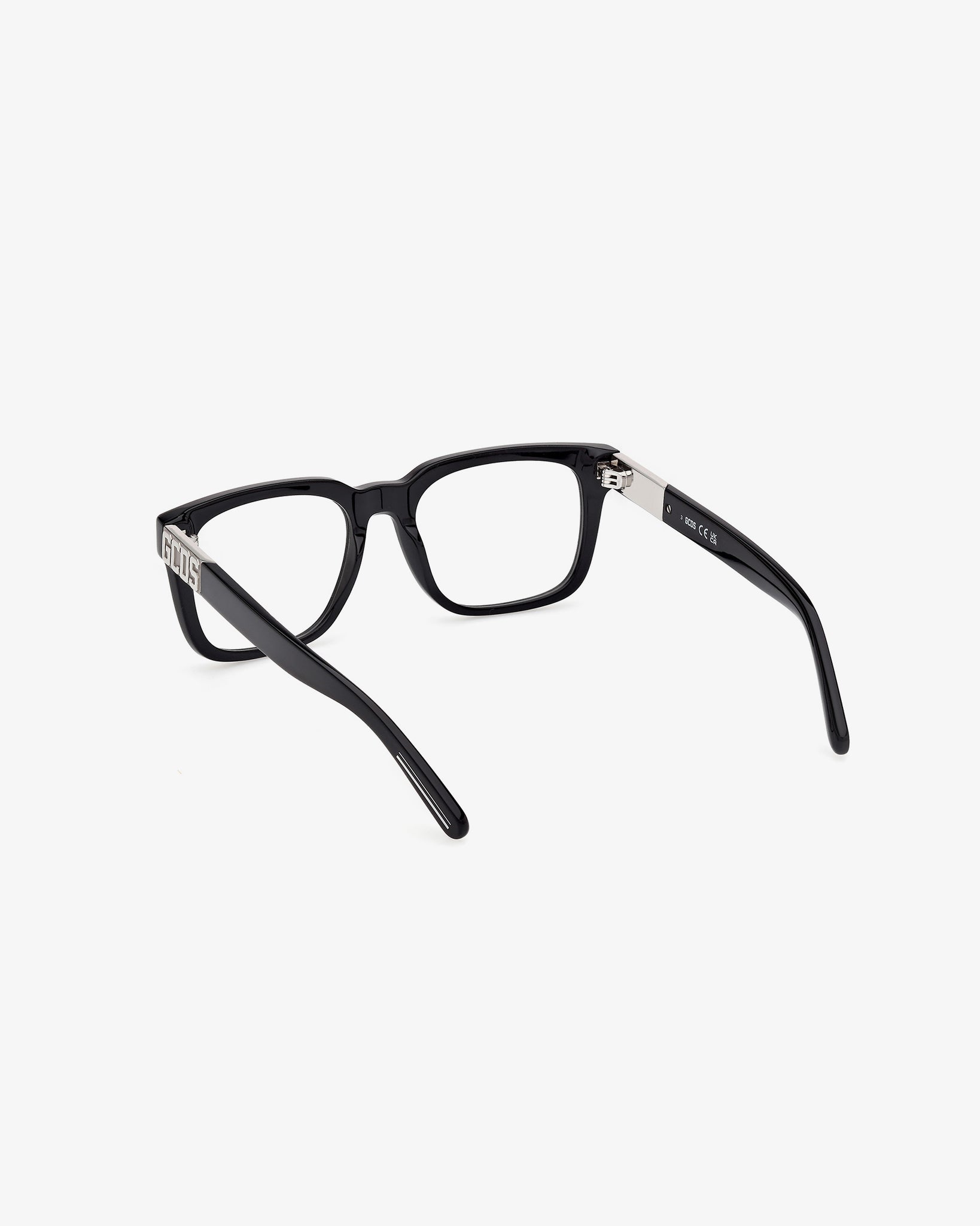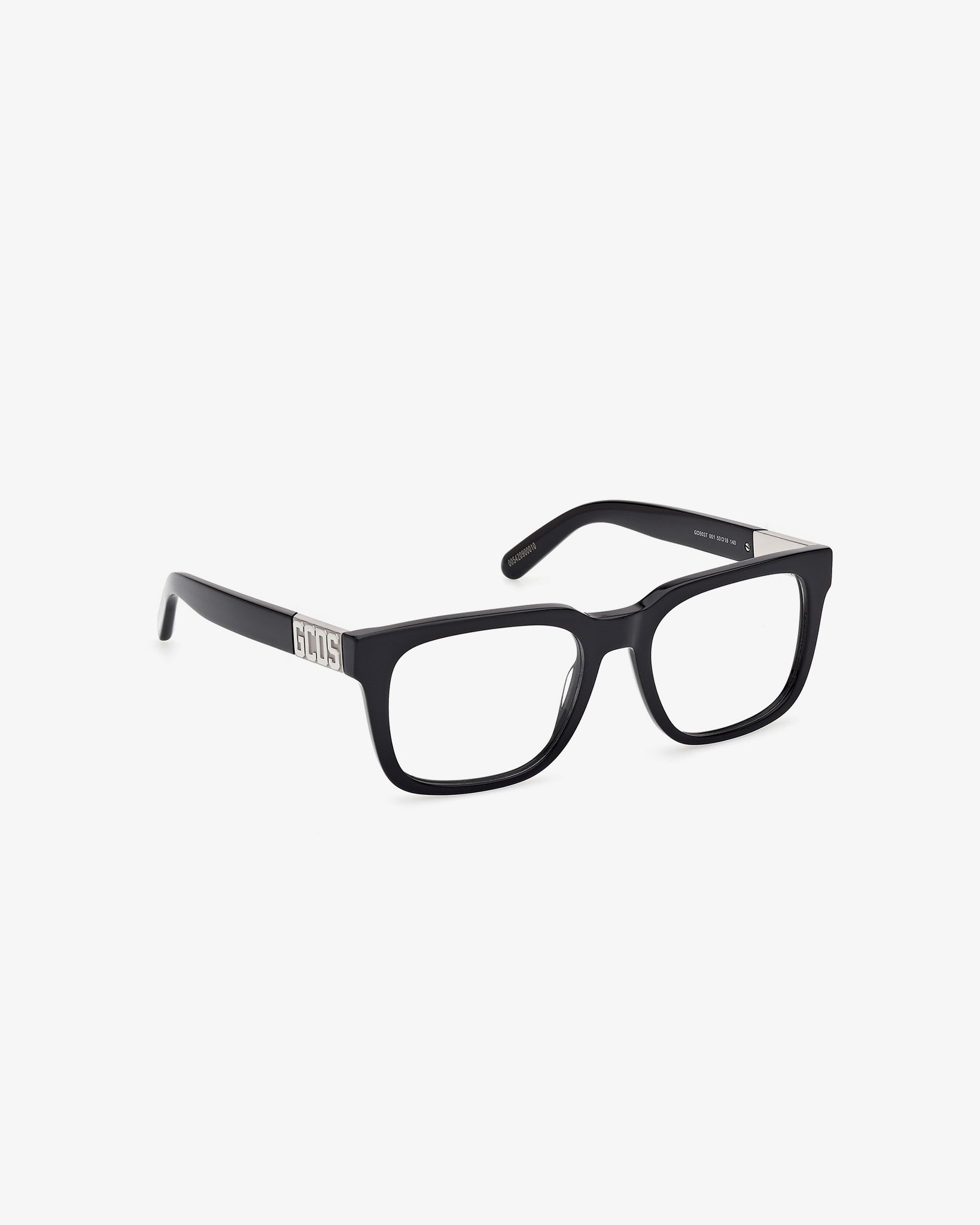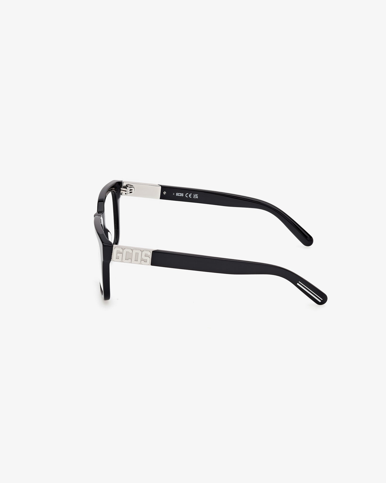 These eyeglasses feature a square frame with a minimalist and modern design, made of shiny black acetate with the metal GCDS logo detail engraved on the temples.