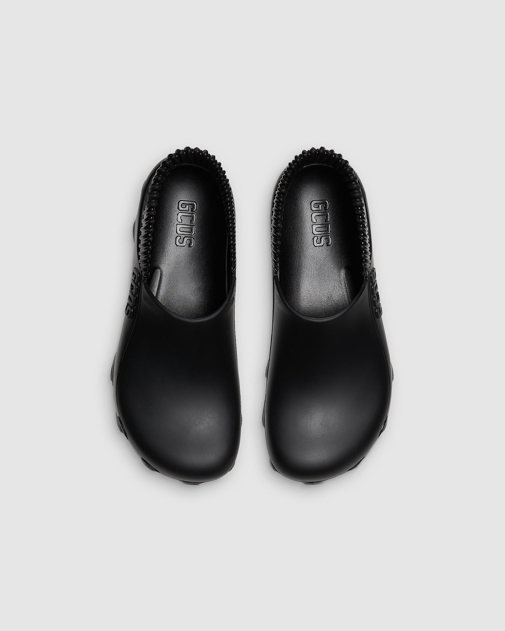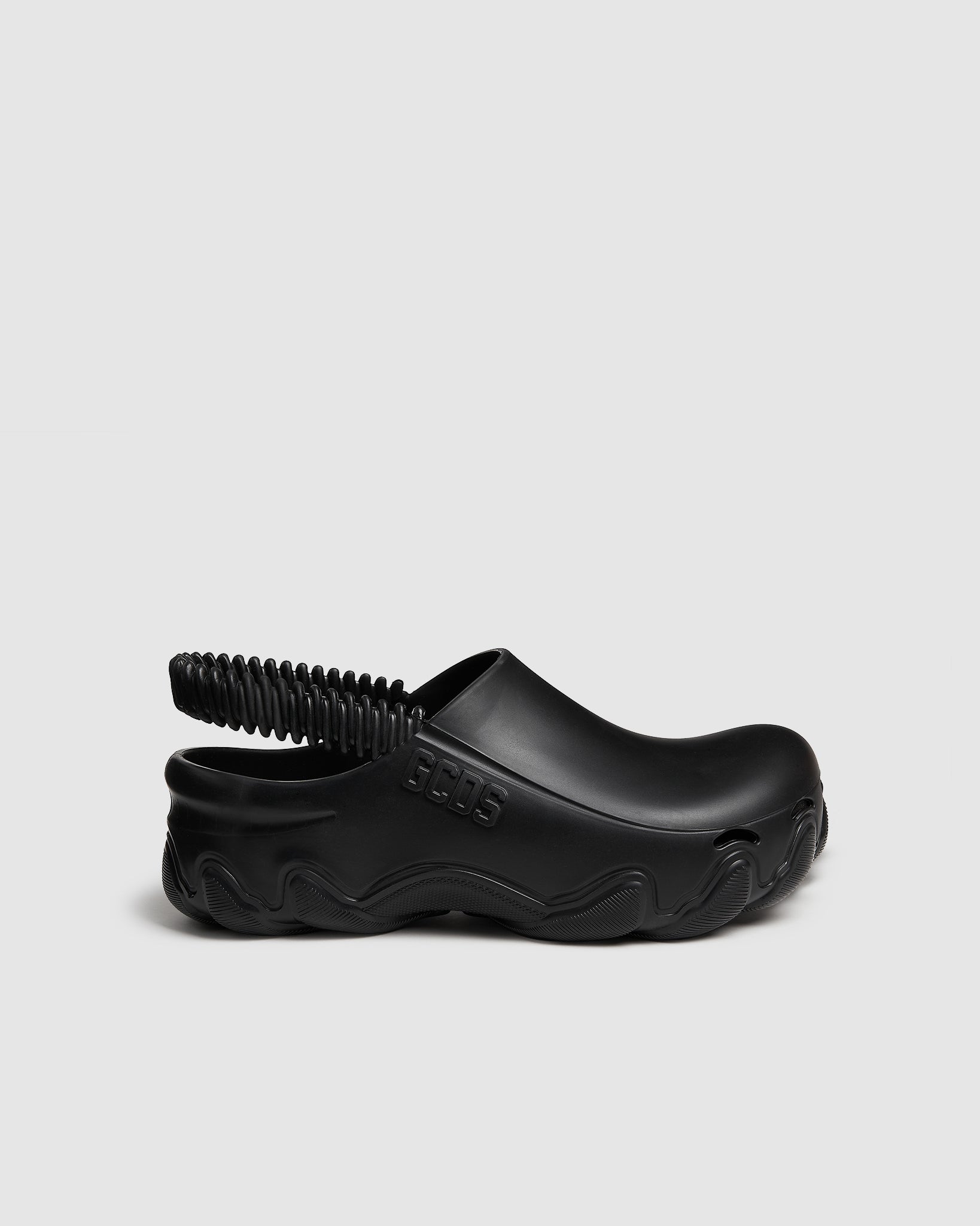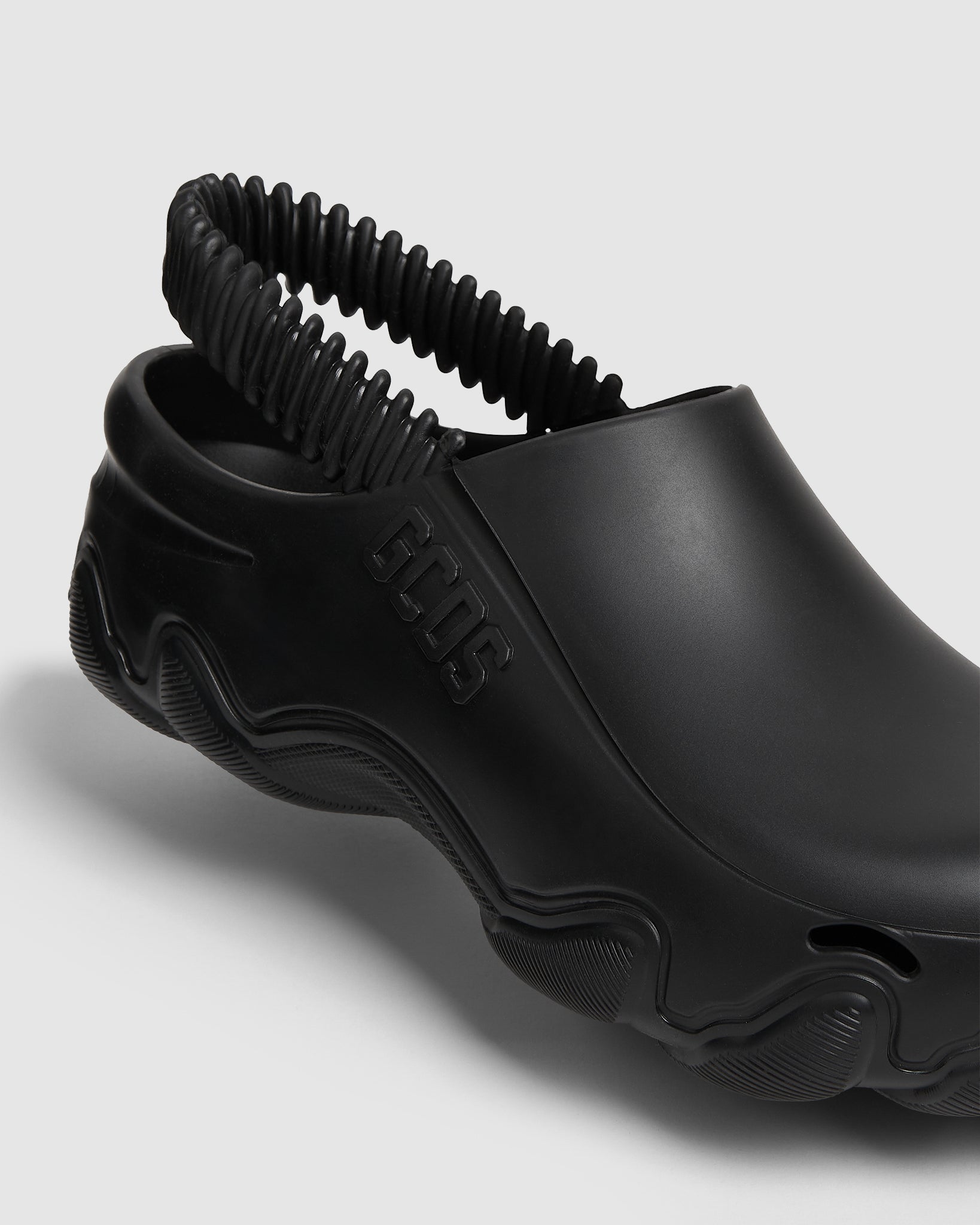 Rubber GCDS clogs with non-adjustable curled effect band. Chunky sole and GCDS logo on the outsole.