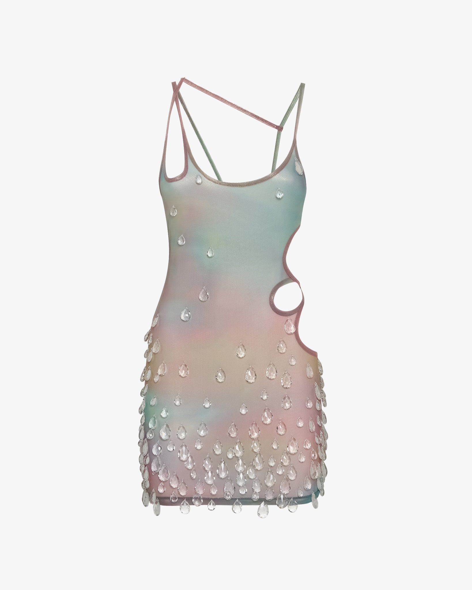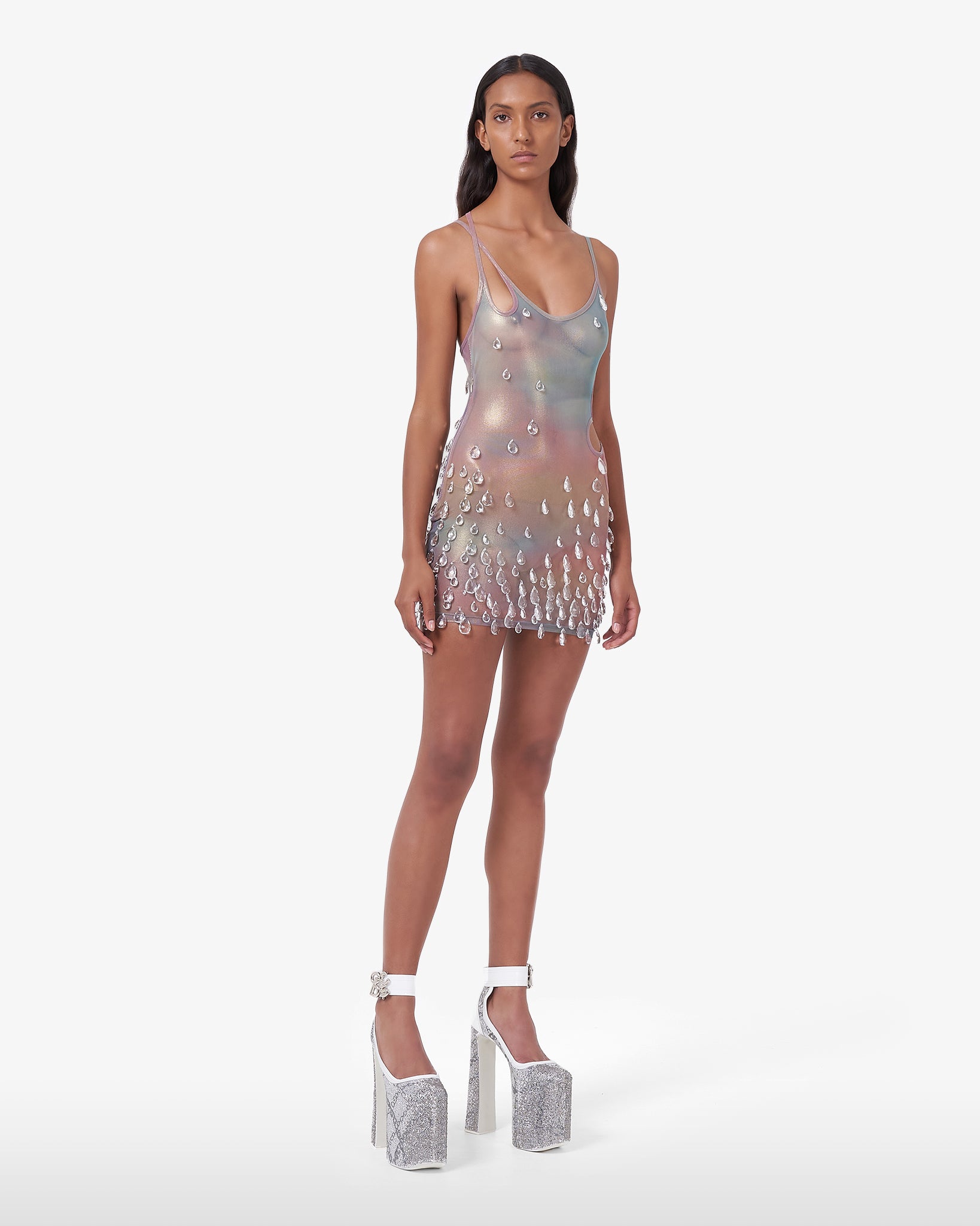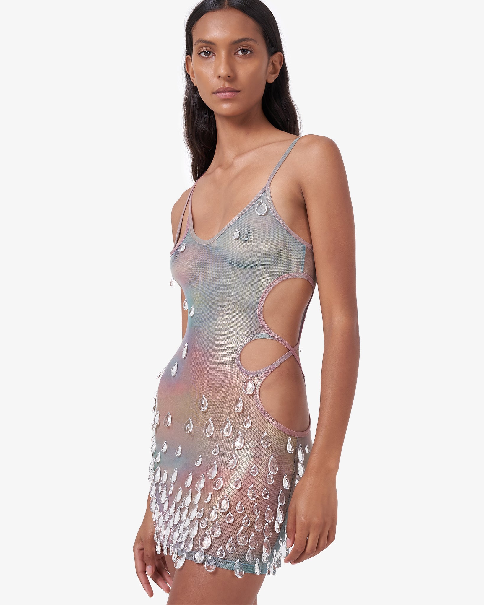 Mini dress with holes placed in tulle with shaded print laminated effect, enriched with crystal drops applied by hand degradé effect.