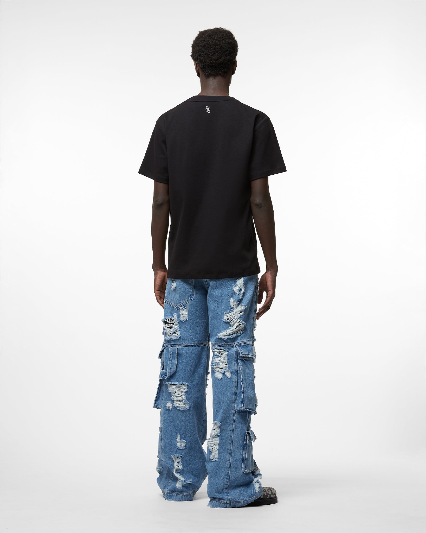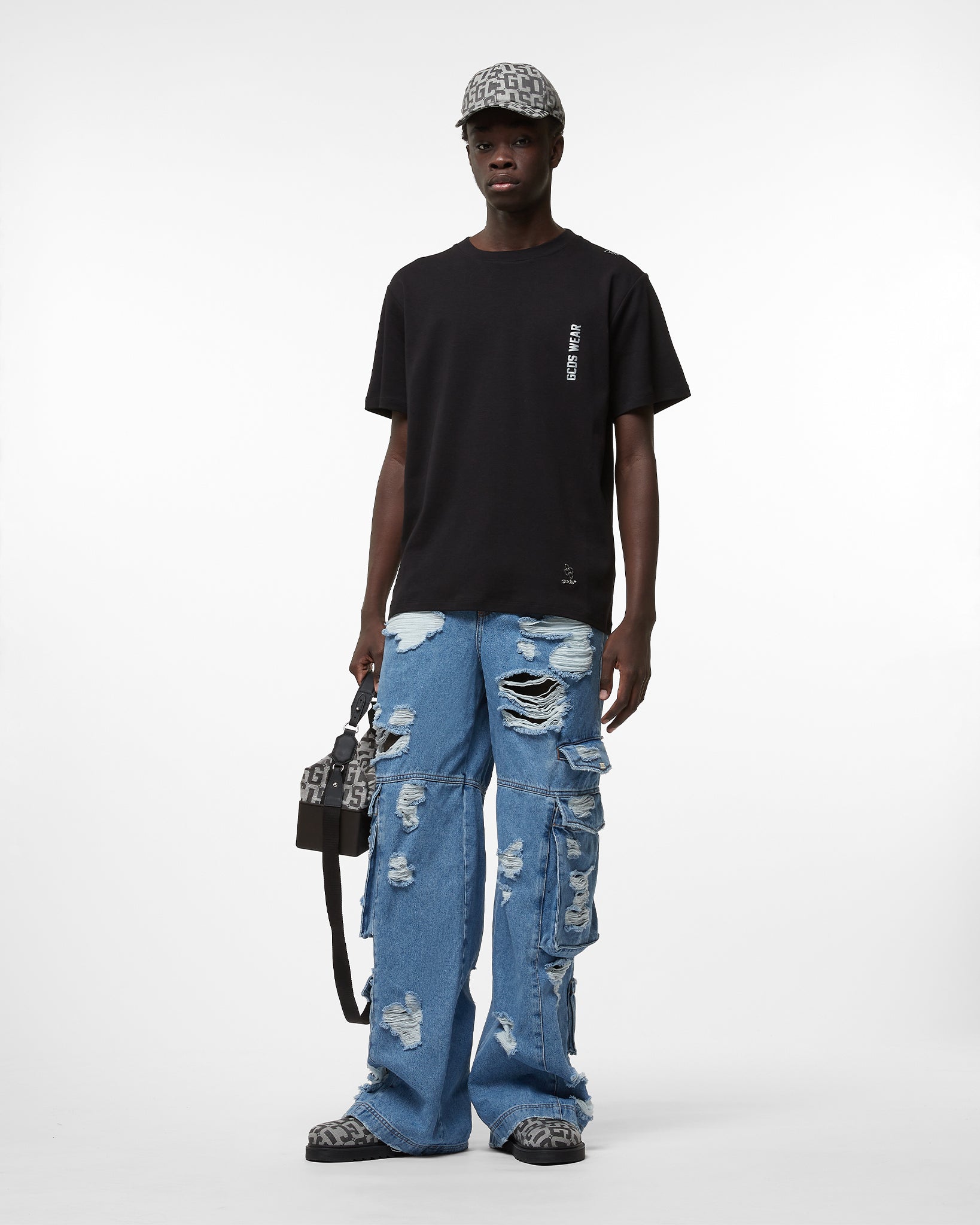 Stone washed light bleached denim cargo pants. Distressed effect. Side cargo pockets. Polished nickel logo plaque on the side pocket. Zipped pocket and zipper pull on the right hip. Super oversized fit.