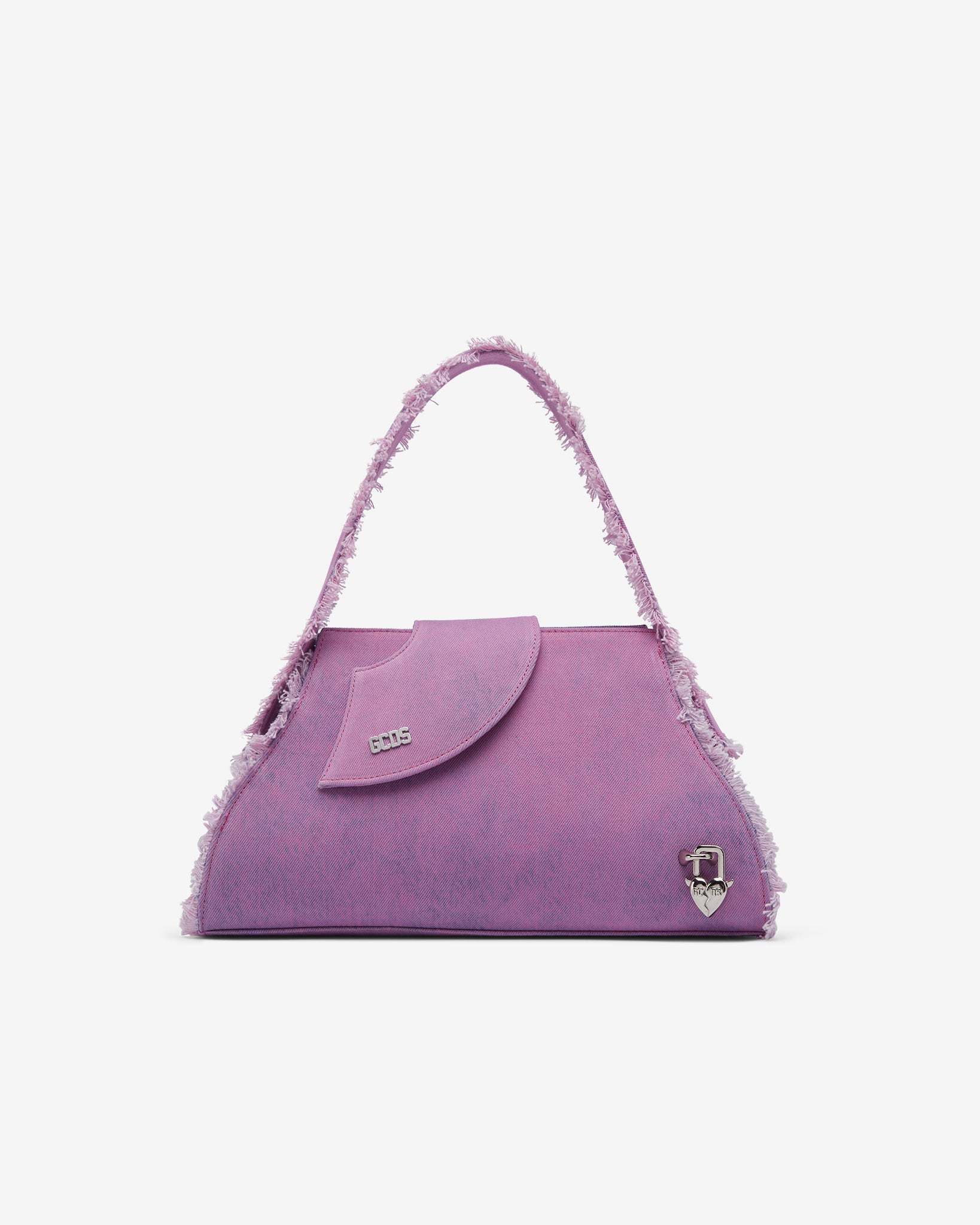 Large flare-shaped overdyed bleached denim comma bag with a distressed effect. Asymmetrical curved flap with polished nickel GCDS logo on the end and magnetic button. Denim handle with semi-hidden snap hooks. GCDS “piercing cuore” snap hooks may be attached to the eyelets on the handle and bottom of the bag. Jacquard logo lining and card holder pocket with heat-embossed logo on the inside. Denim bottom with 5 polished nickel feet.