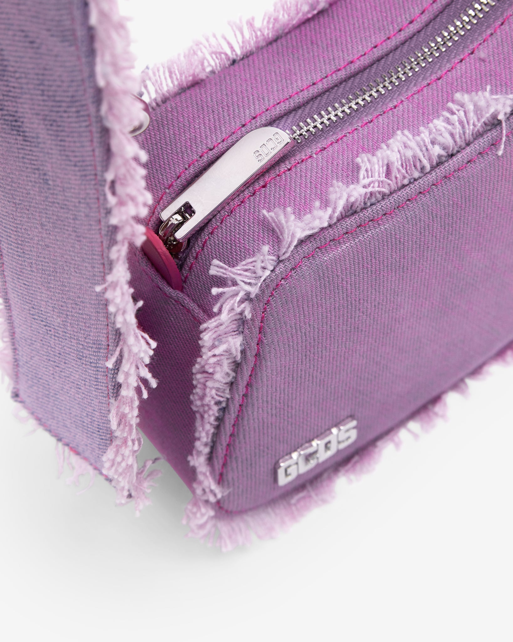 Medium curve-shaped overdyed bleached denim structured crossbody comma bag with a distressed effect. Adjustable denim handle with 4 semi-hidden snap hooks. Polished nickel logo plaque and GCDS “piercing cuore” snap hooks on the front. Jacquard logo lining and leather trim on the inside. Internal card holder pocket with heat-embossed logo.