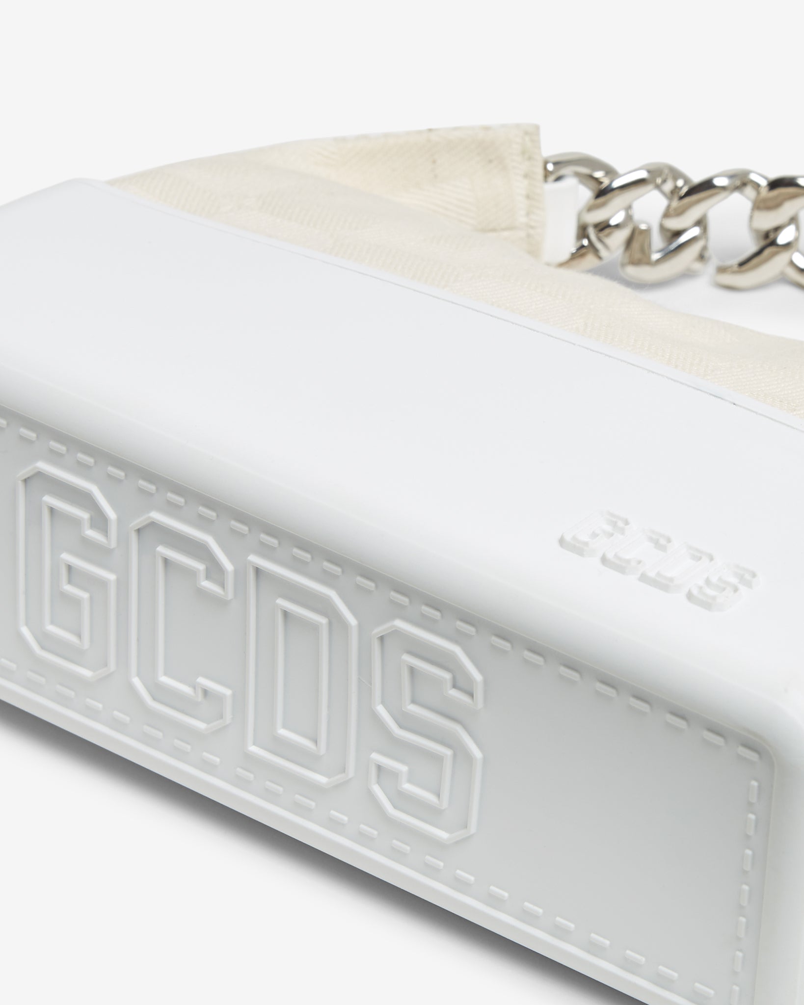Ecru GCDS monogram Jacquard mini bag. Polished nickel GCDS logo chain handle with rubber-textured leather trim. Classic small Matilda rubber bottom characterized by double raised logo and top-stitching on the bottom. Support straps with jacquard logo on the sides to match the base. Jacquard logo lining and leather trim with heat-embossed logo on the inside.