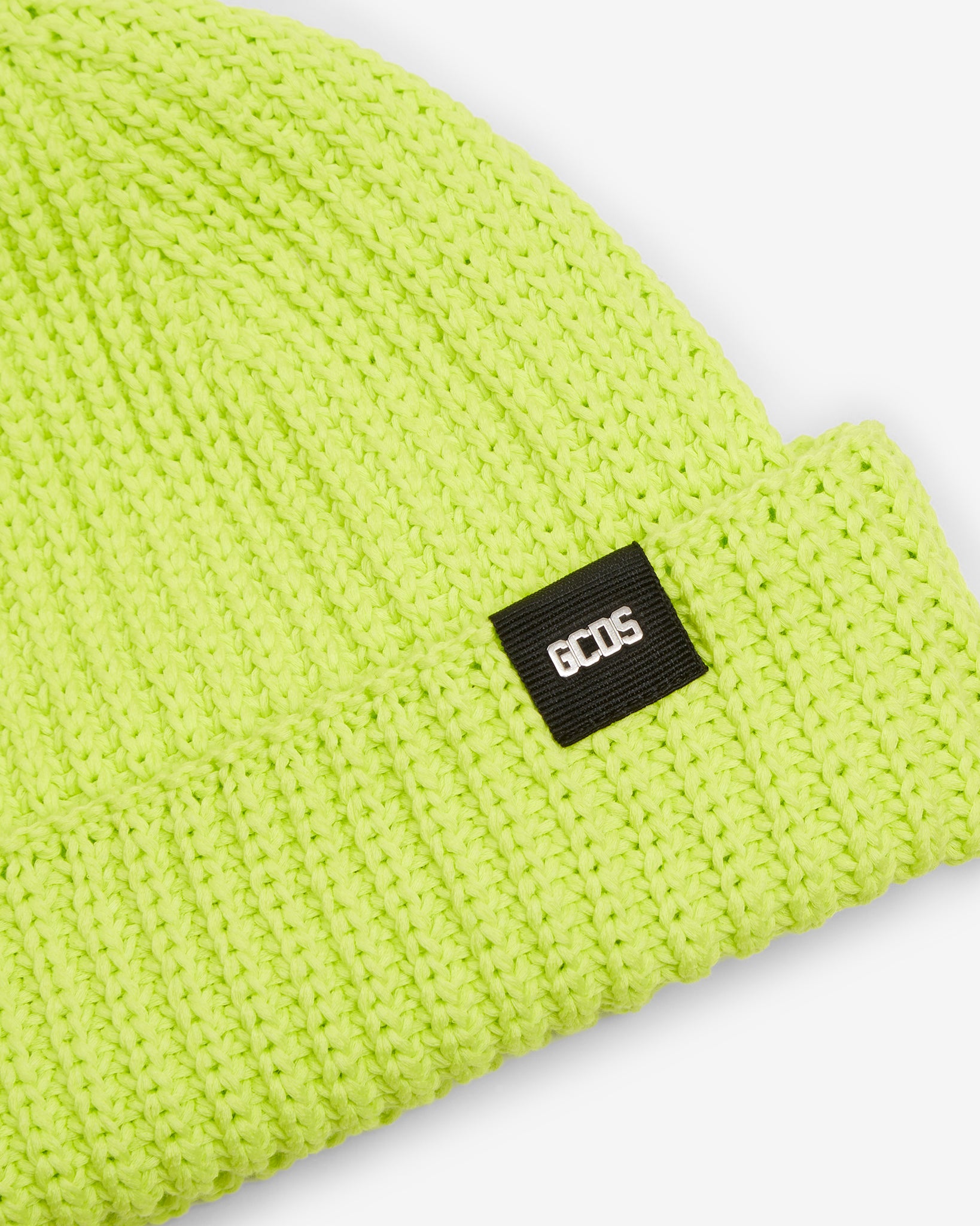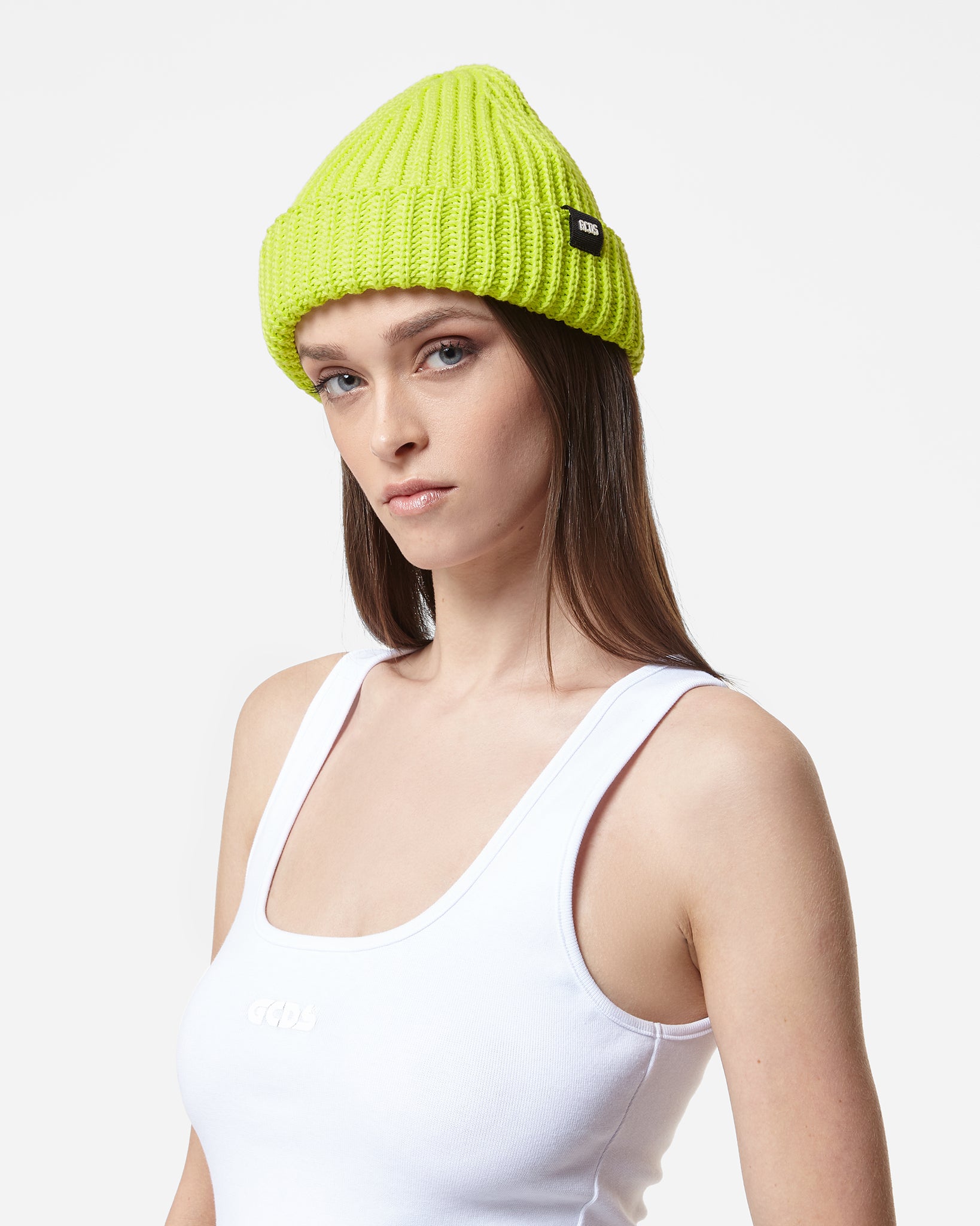 Polyamide and cotton blend ribbed beanie with cuff. Scattered rips and grosgrain band with polished nickel GCDS logo plaque.
