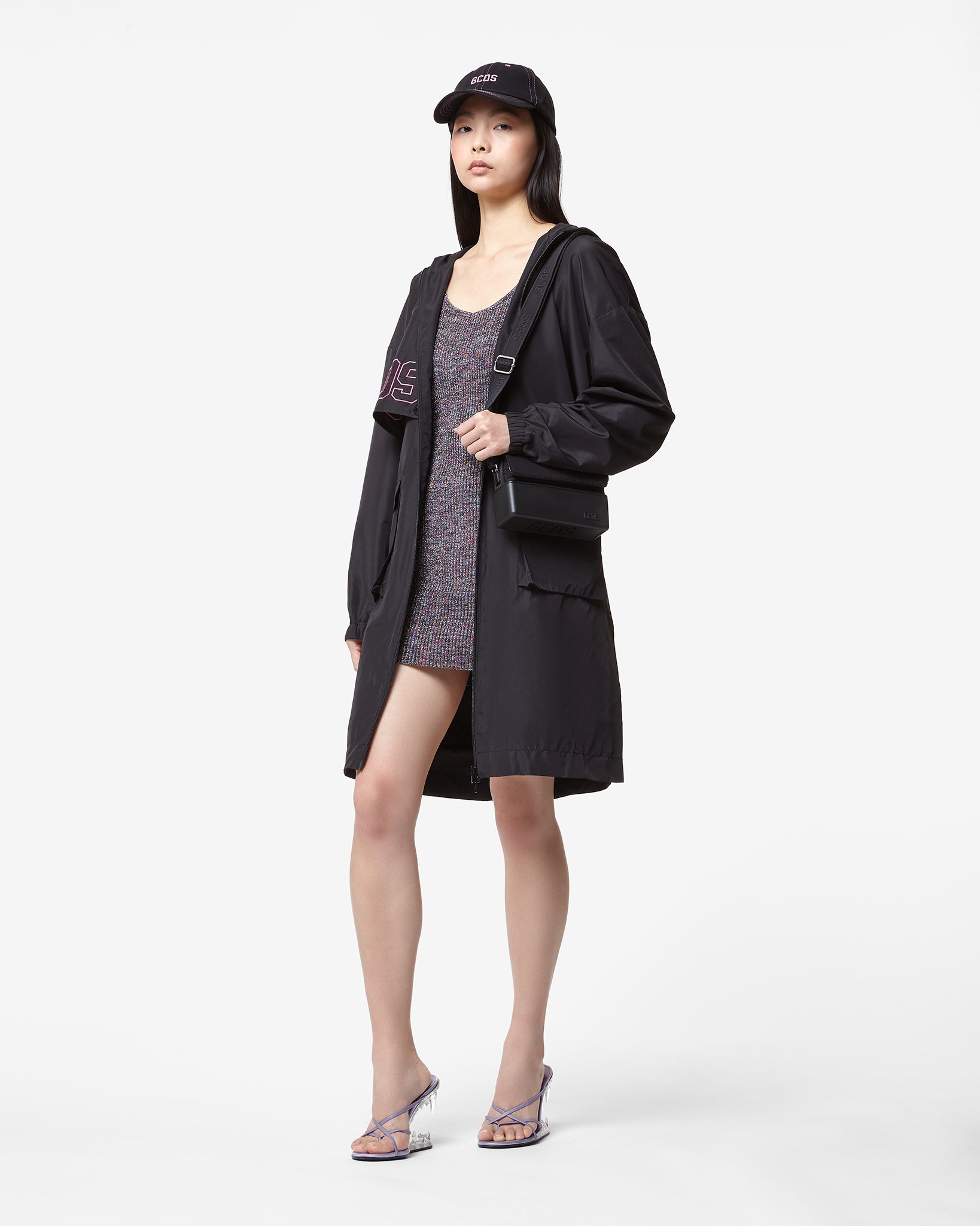 Long nylon anorak with hood and anti-wind flap on the front, decorated with contrasted GCDS logo embroidery. Double pocket with flap on the front. Rubber “GCDS Cuore” patch on the back.