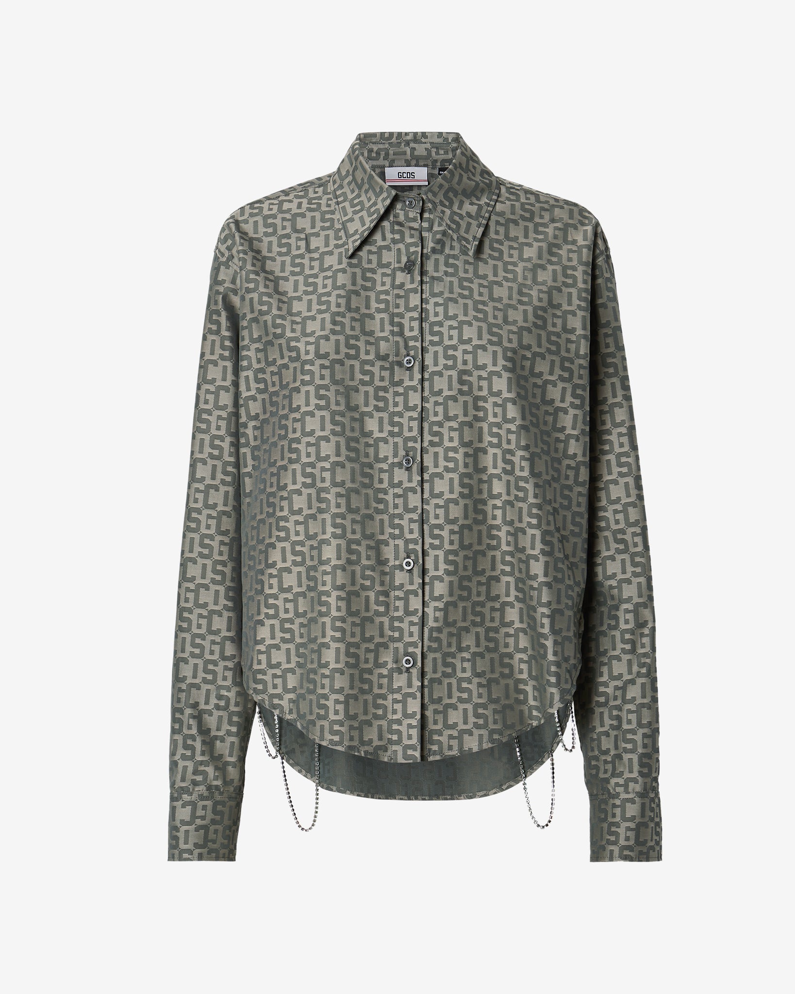 Two-tone monogram GCDS cotton shirt with side slits decorated with a cup chain. Asymmetrical rounded bottom which is longer on the back. Over-sized.