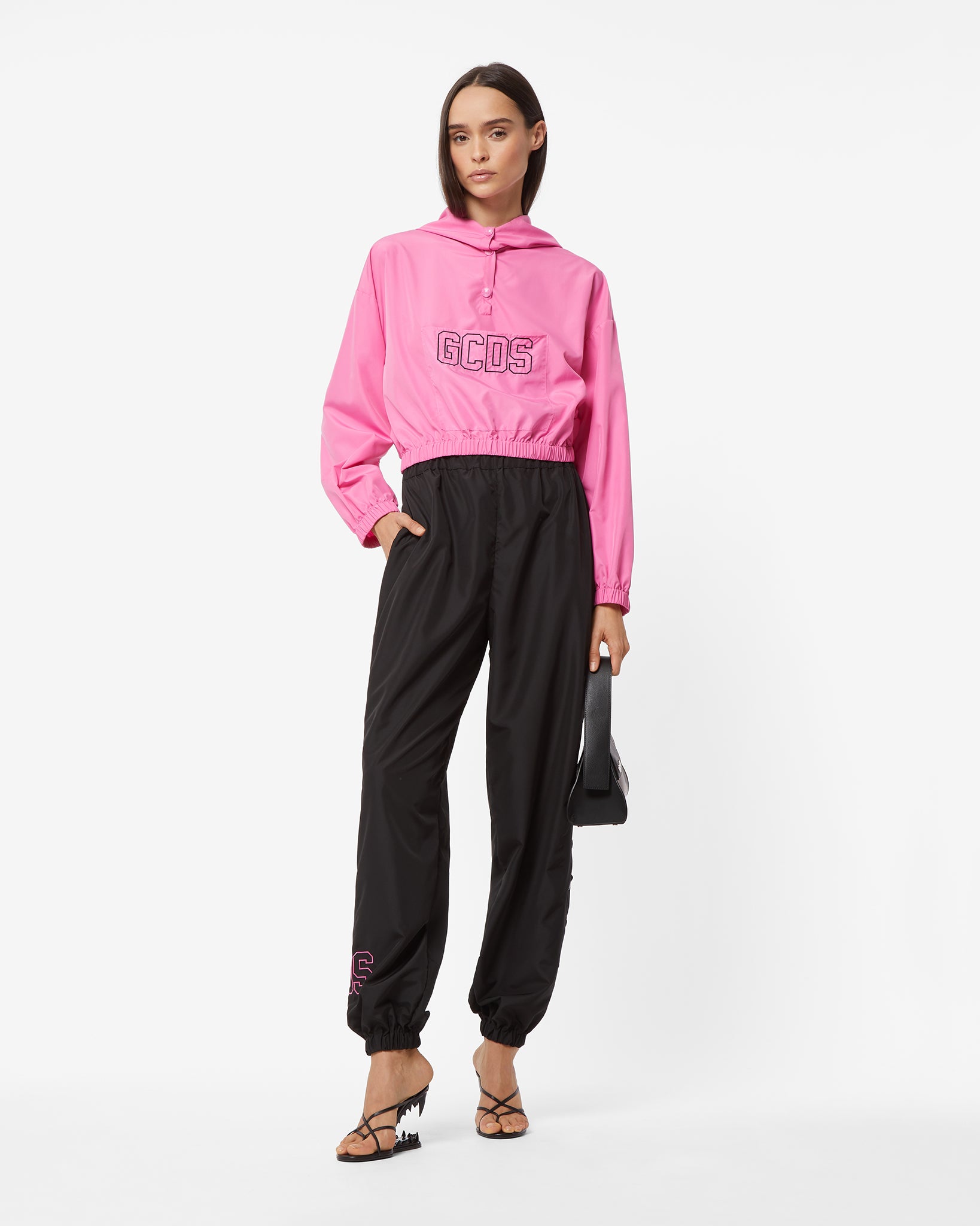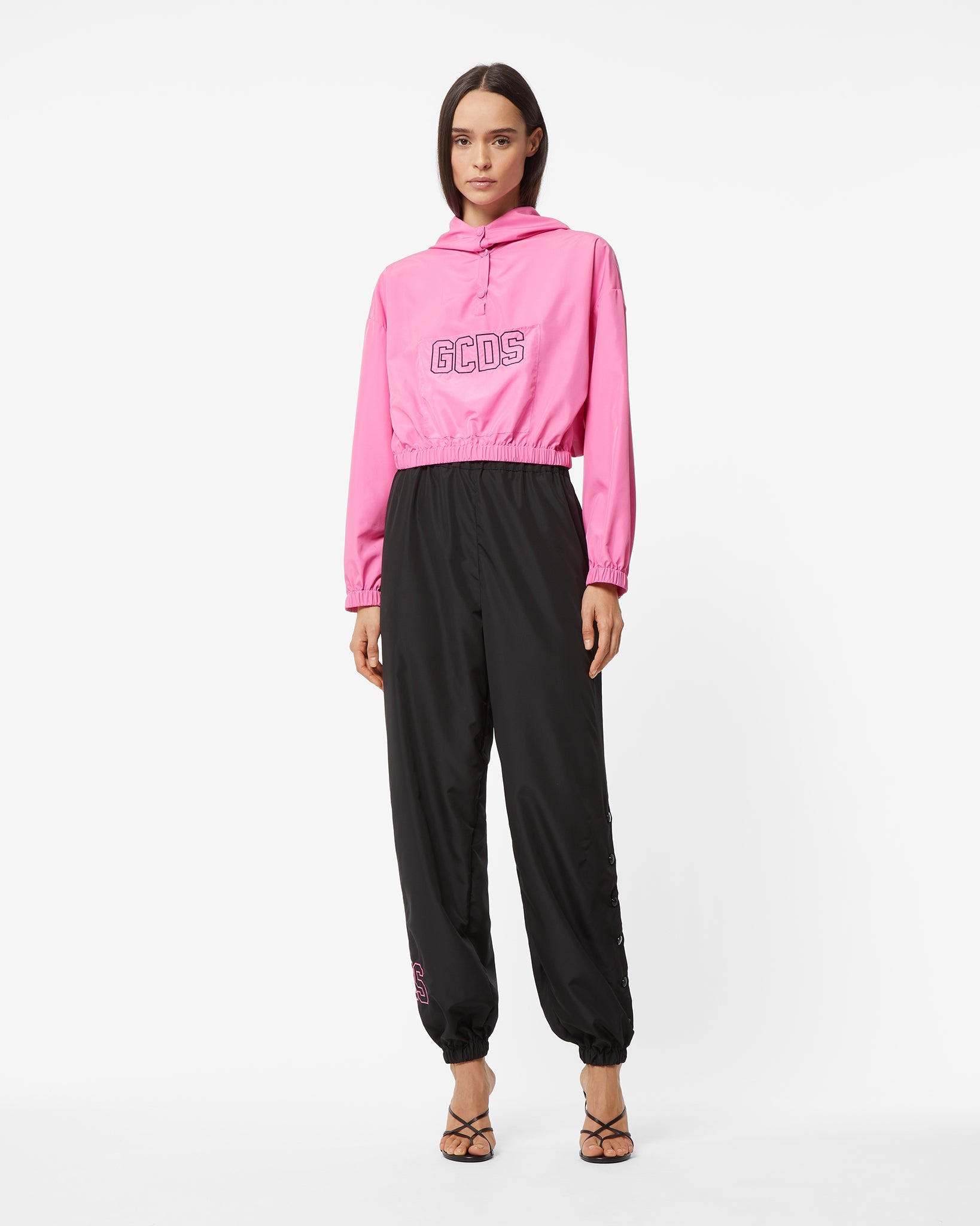Nylon jogging pants. Rubber “GCDS Cuore” patch on the front. Logo embroidery on the bottom of the legs and openings with tone-on-tone logo snap buttons. Stitched pockets, elastic around the waistband and on leg bottoms. Regular fit.