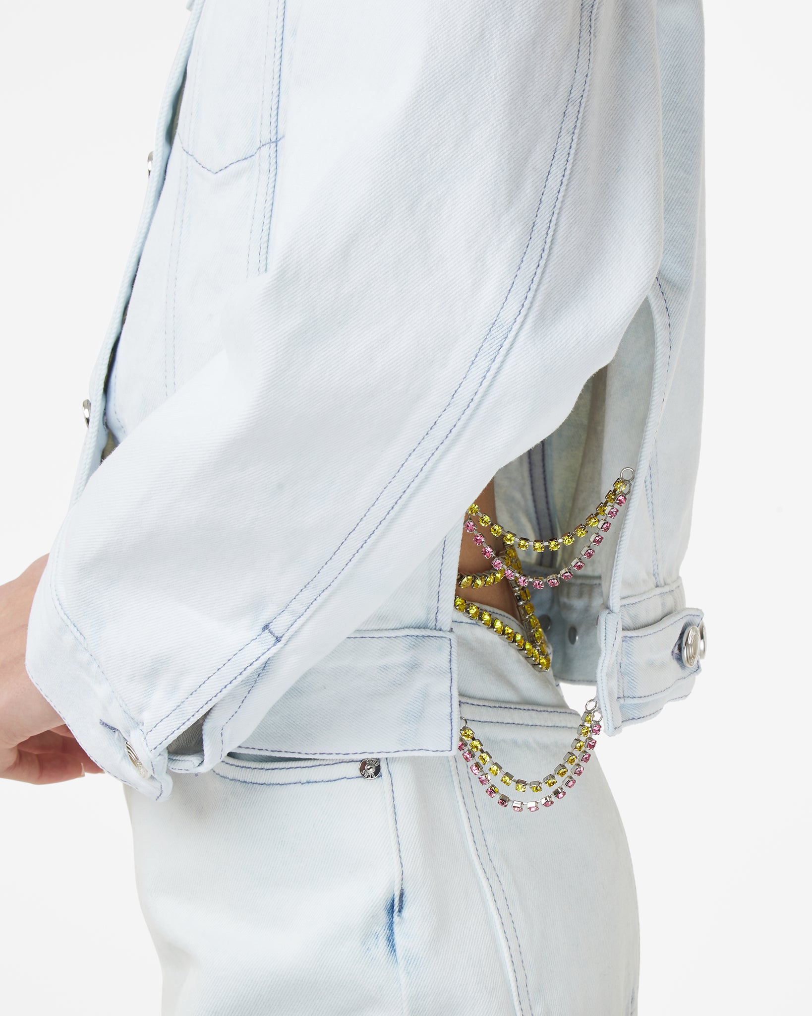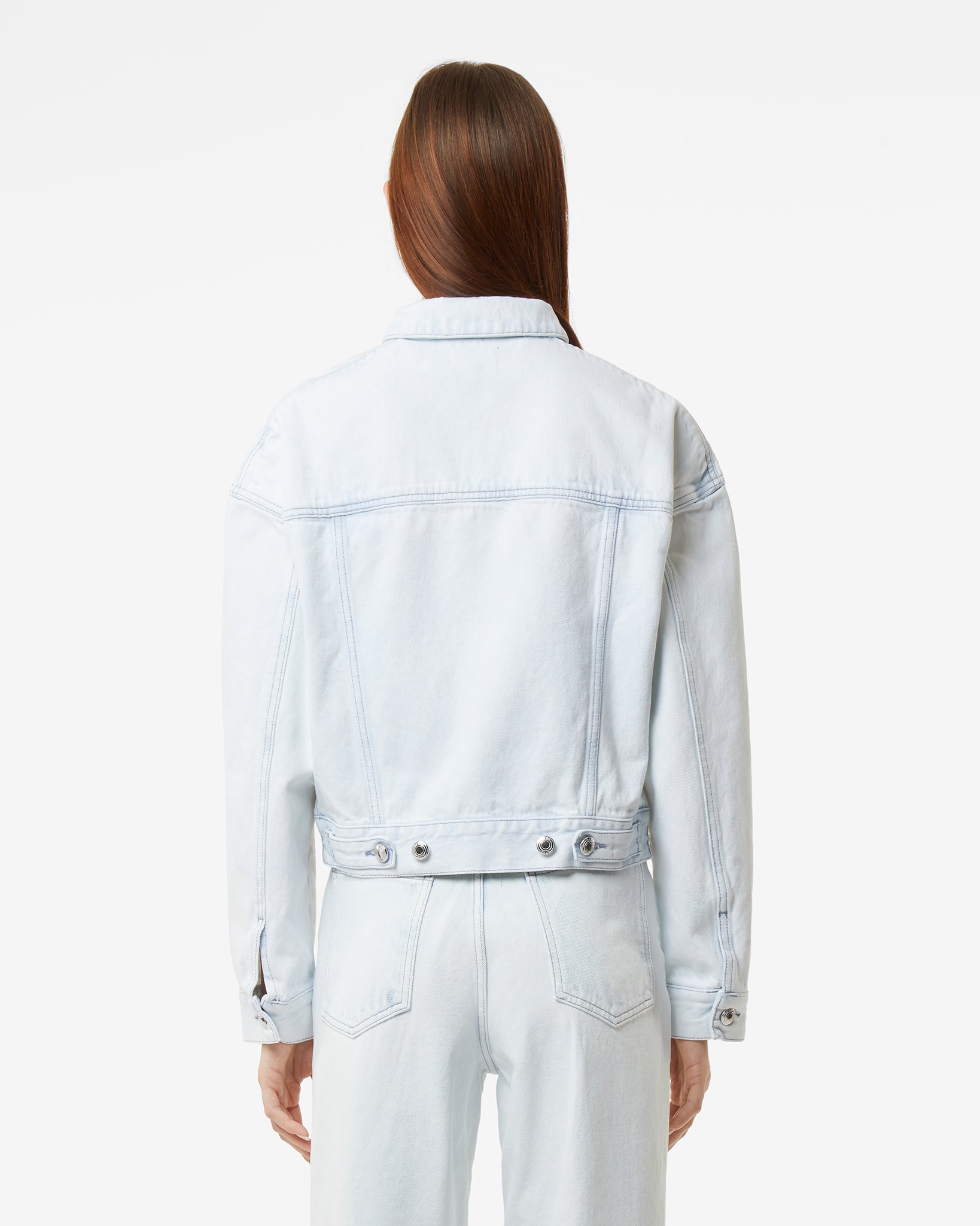 Overdyed bleached denim cropped jacket. Double pocket with stud button. Rubber logo patch above pocket. Side openings with two-tone lime green and fuchsia cup chain. Blue top-stitching and raw-cut at the bottom. Regular fit.