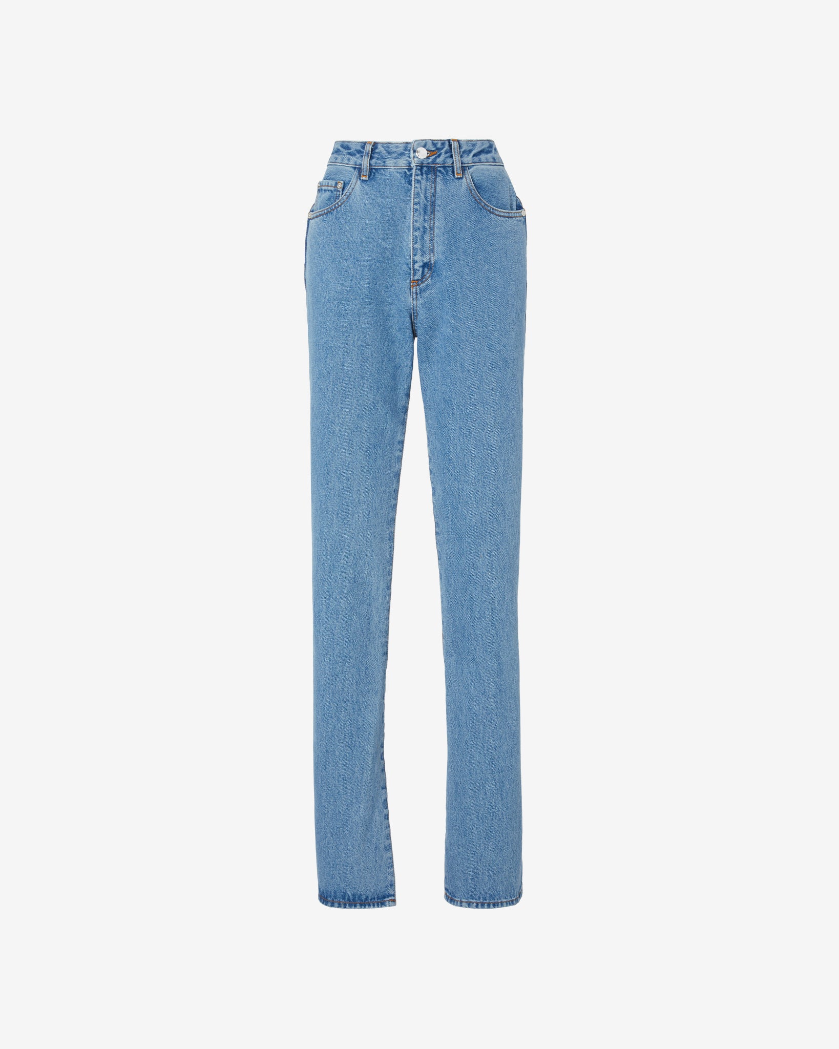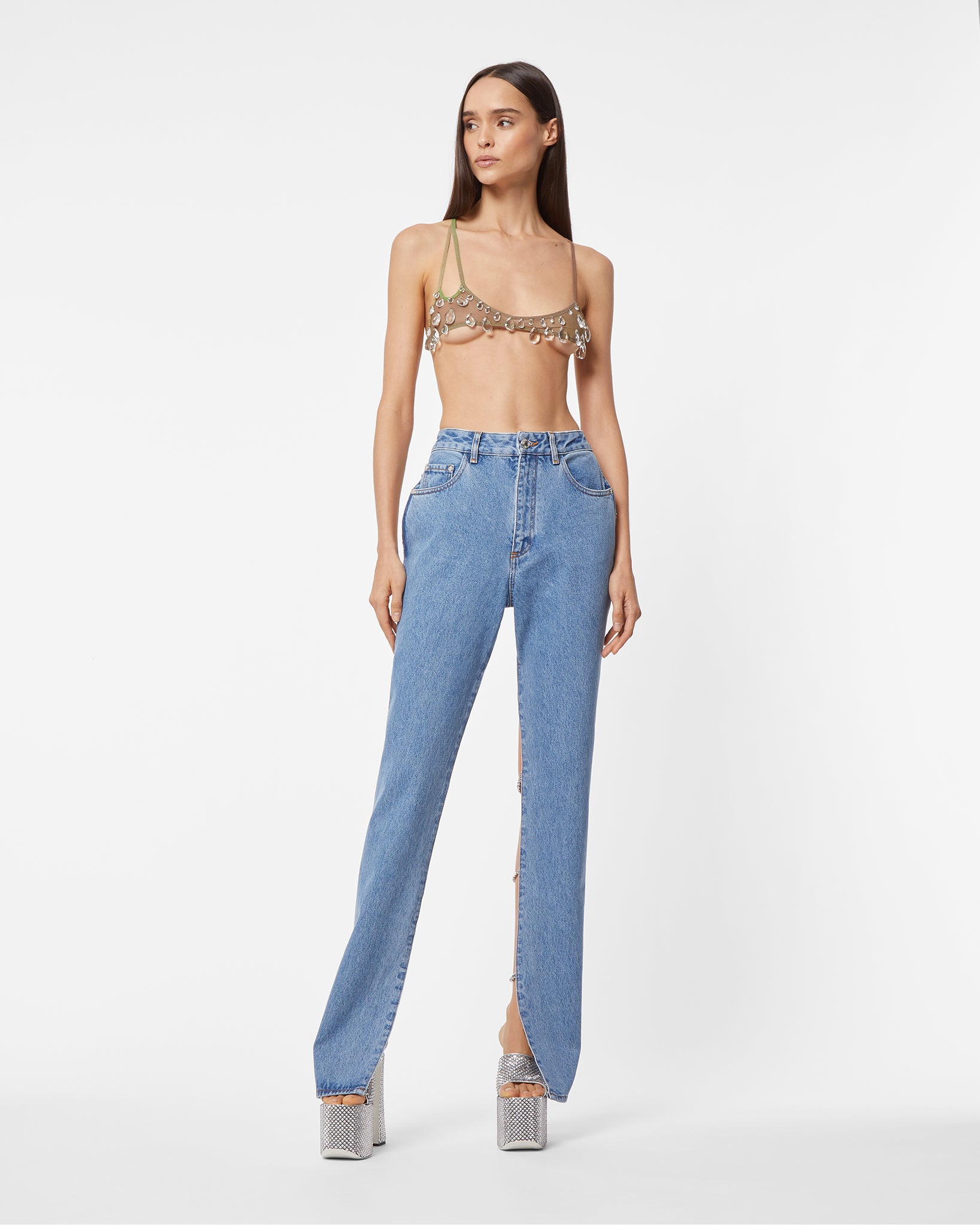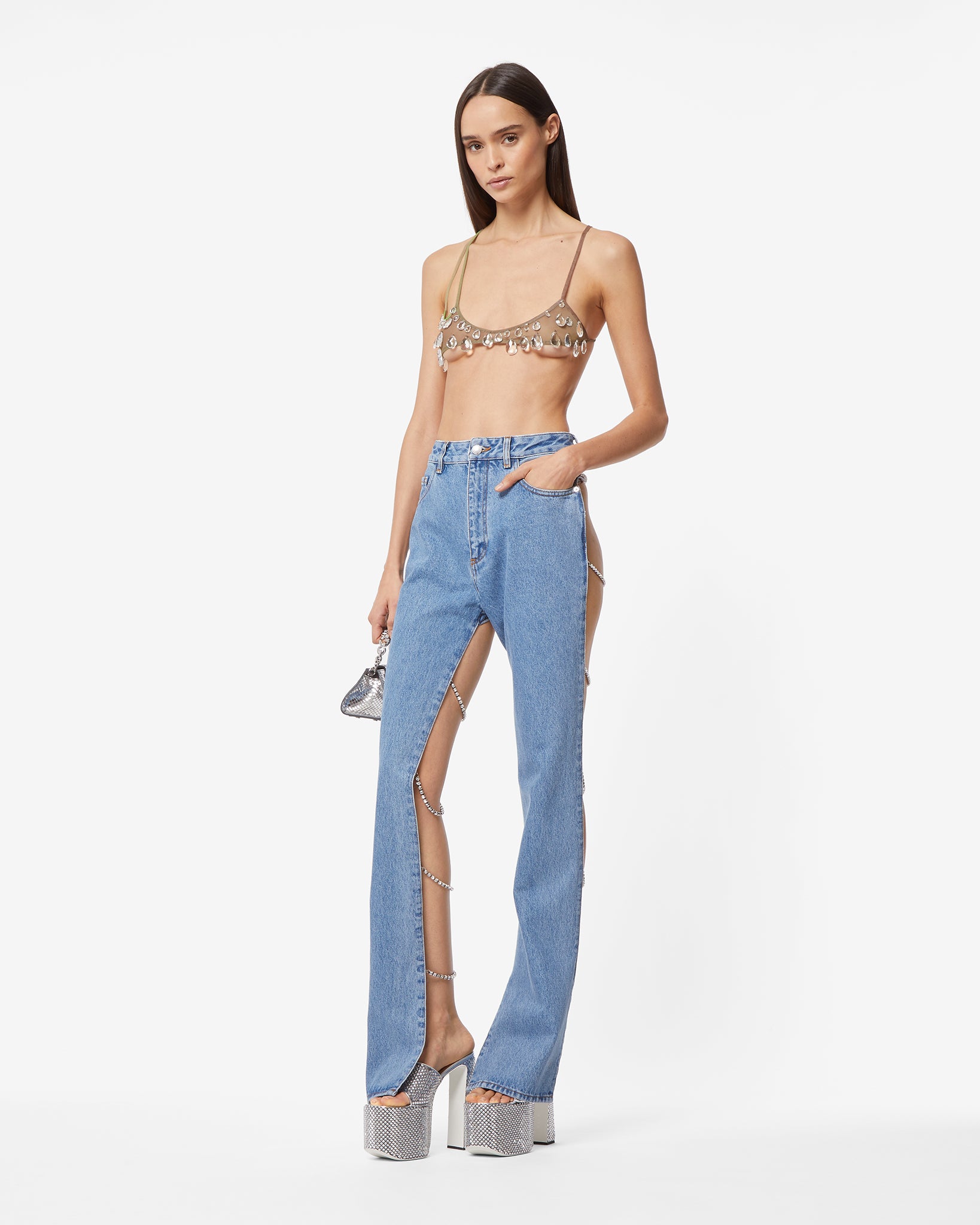 Stone-washed denim straight half trousers. Crystal thong and cupchains on the back.