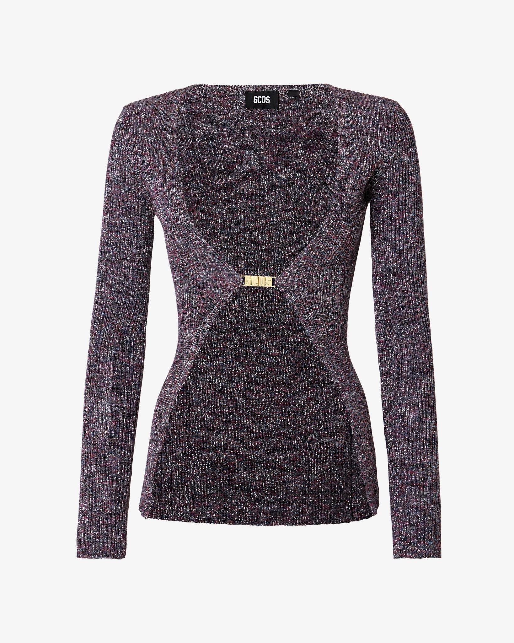 GCDS single tone lurex ribbed cardigan. Logo clip closure at the center front.