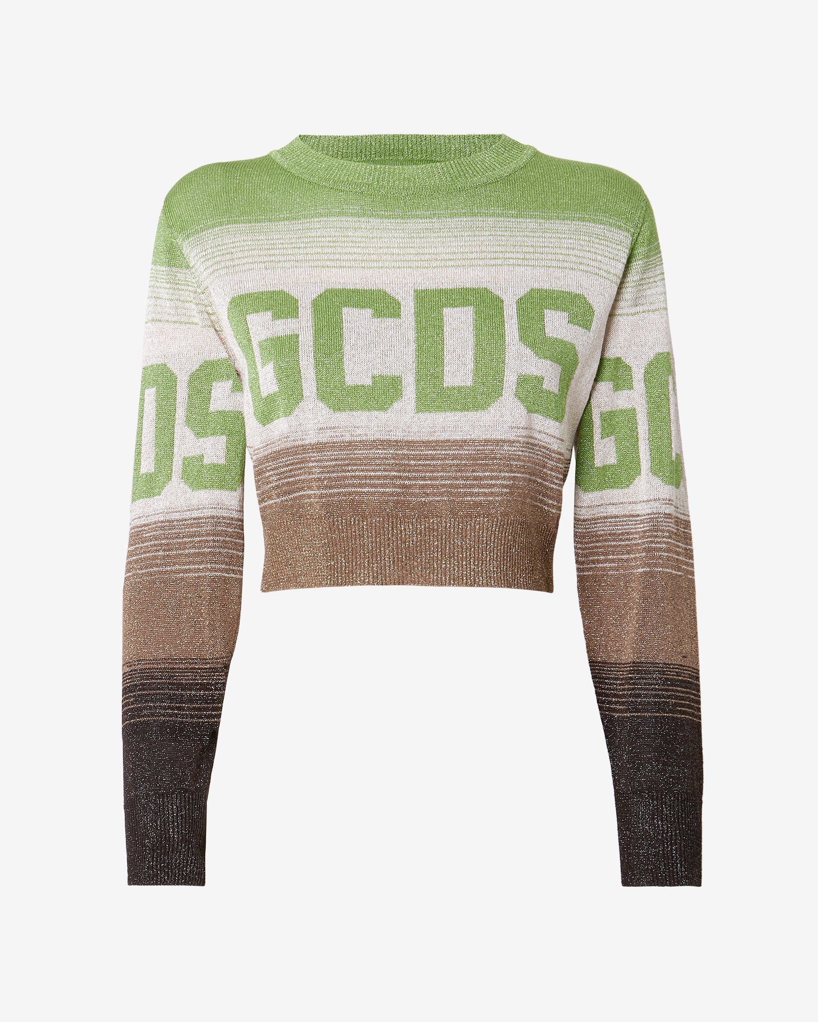GCDS crew neck cropped plain knit sweatshirt in four-tone lurex with faded effect. Inlaid GCDS logo on the front and sleeves.