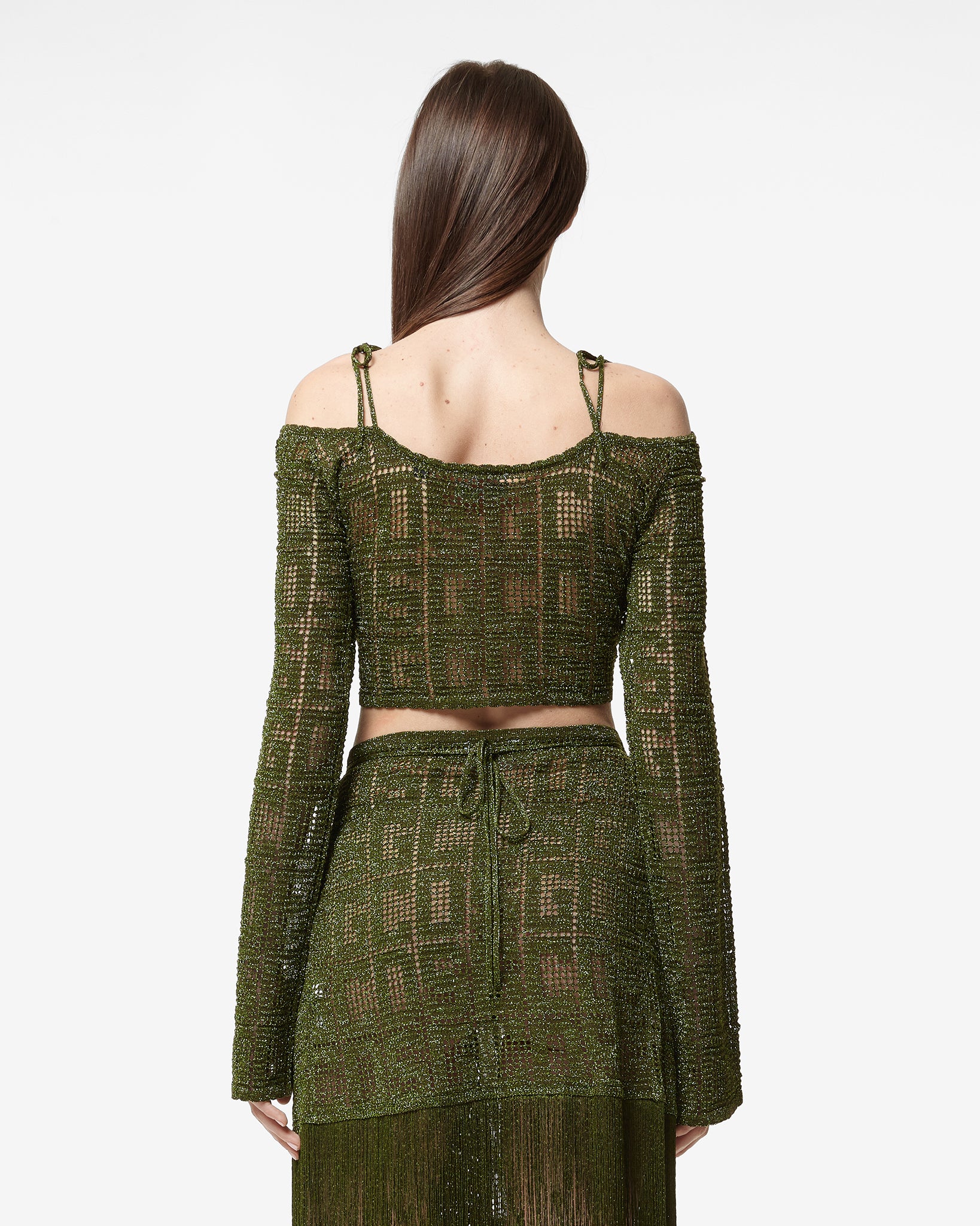 Long-sleeved boatneck lurex mini top. See through crochet GCDS monogram effect. Straps with bows. Finishing in cloud stitch.