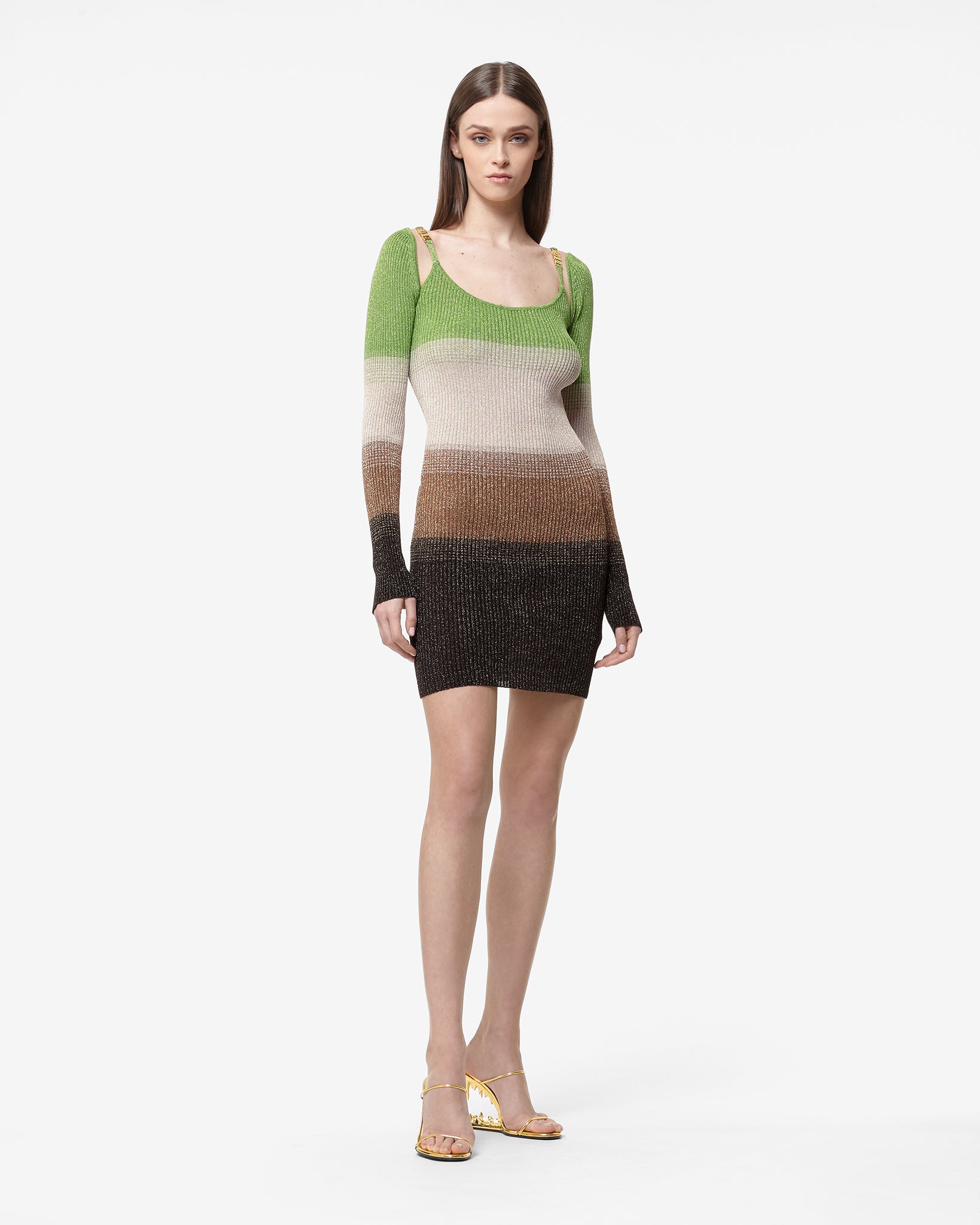 Four-tone long-sleeved lurex faded effect ribbed mini dress. Off-the-shoulder plunging neckline. Straps with logo clip. Wide neckline on the back.