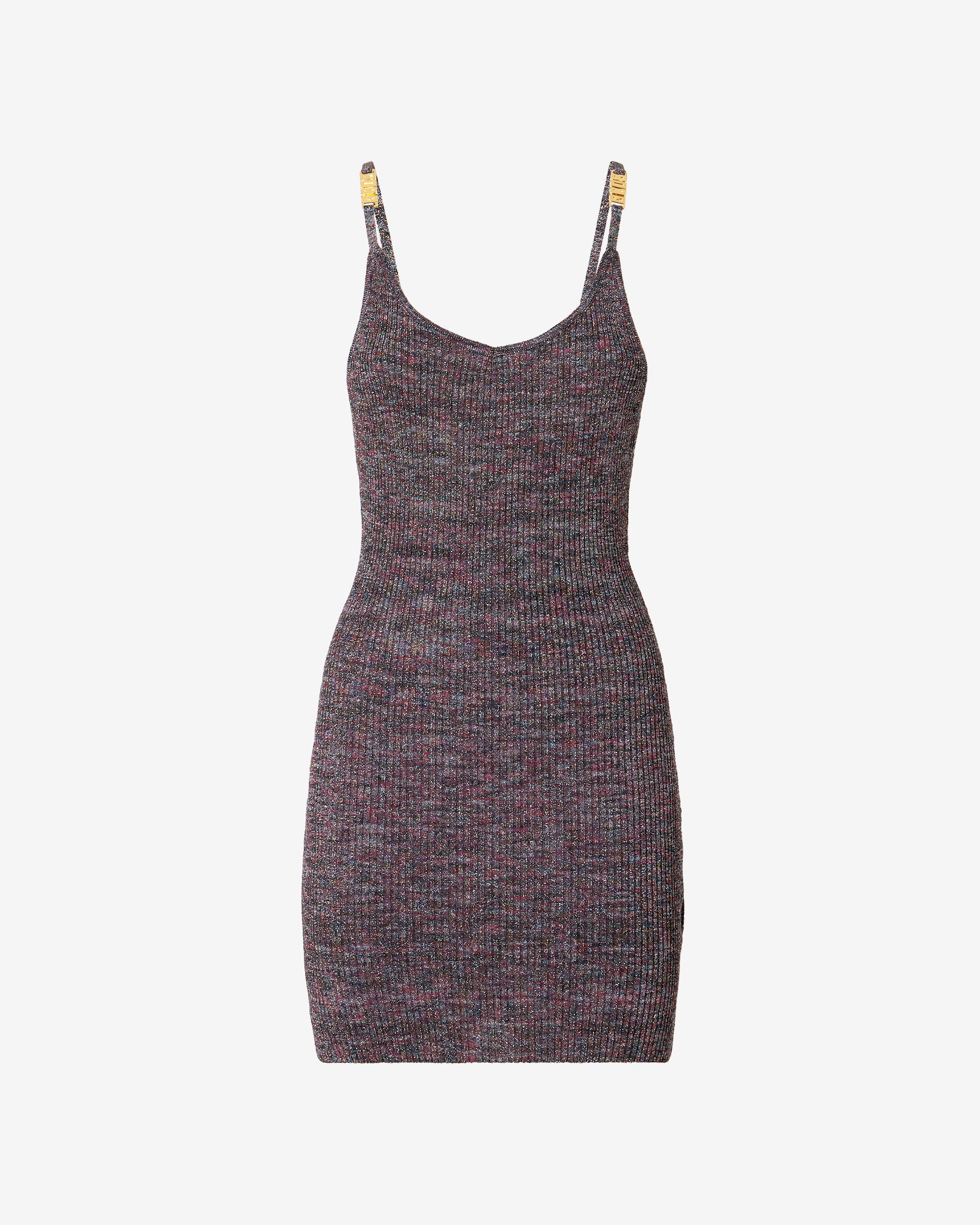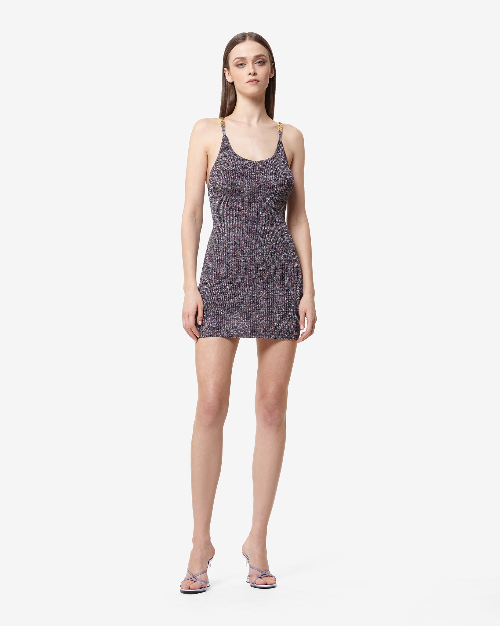 Ribbed mini dress in single tone lurex. Straps with logo clip. Wide neckline on the back.