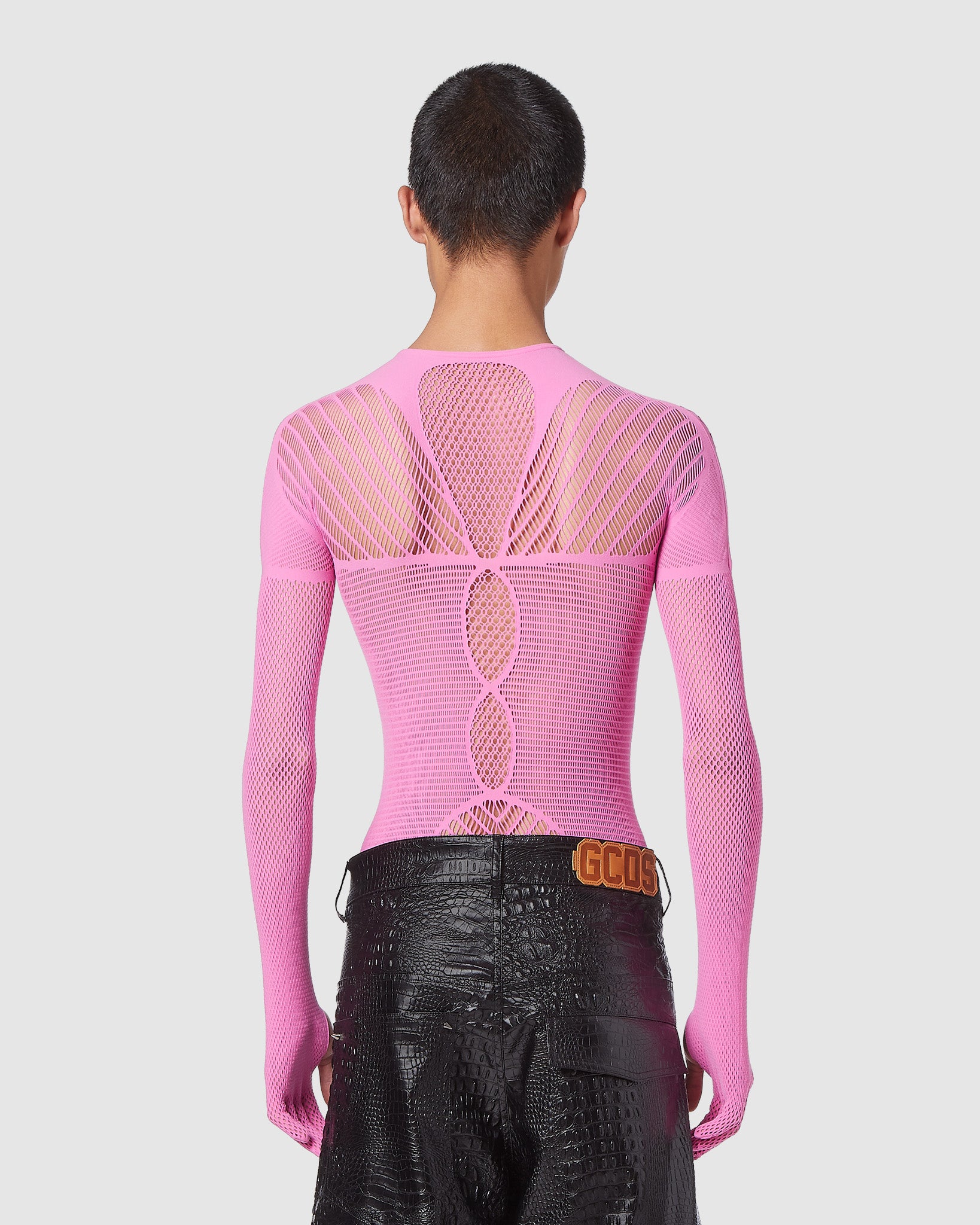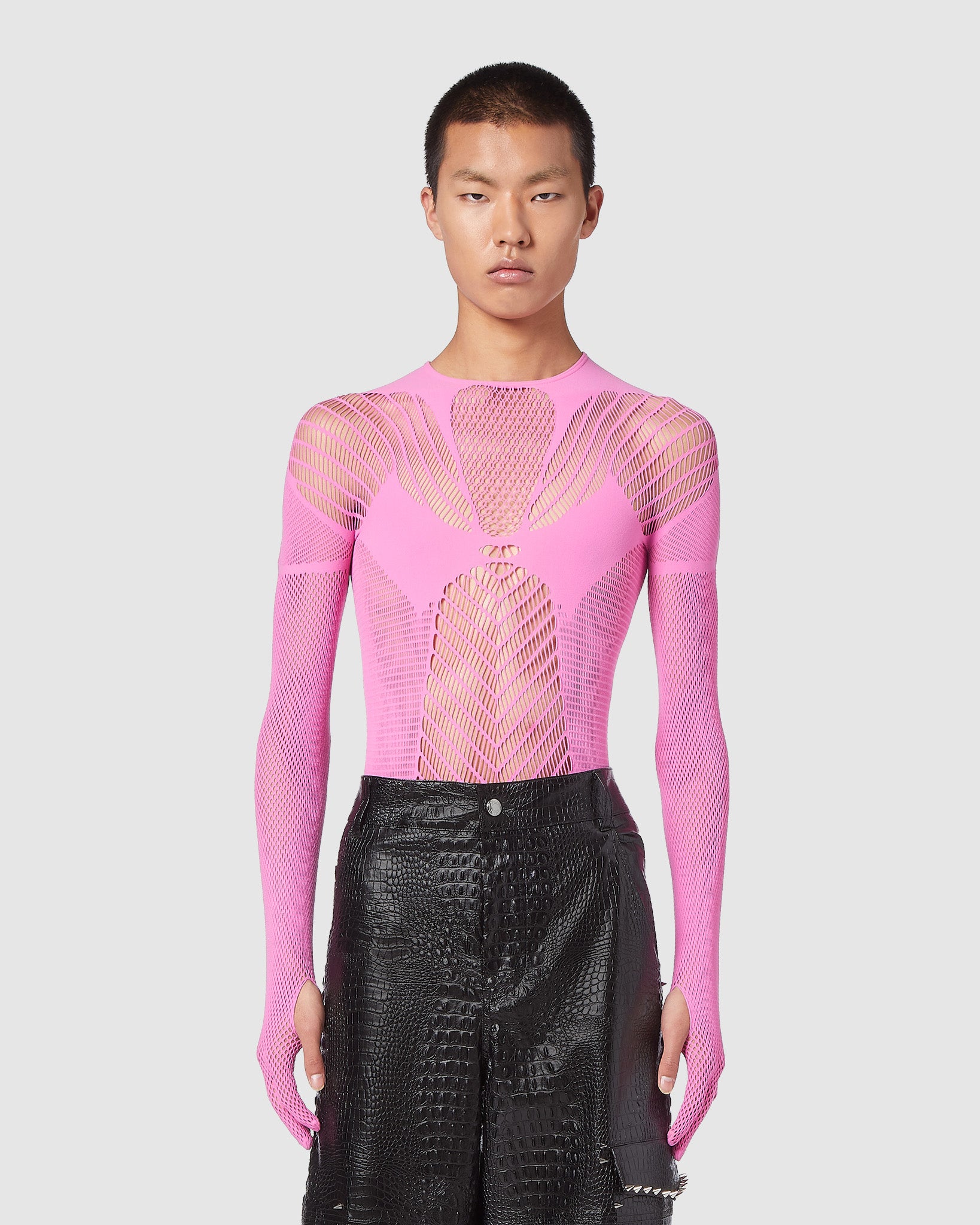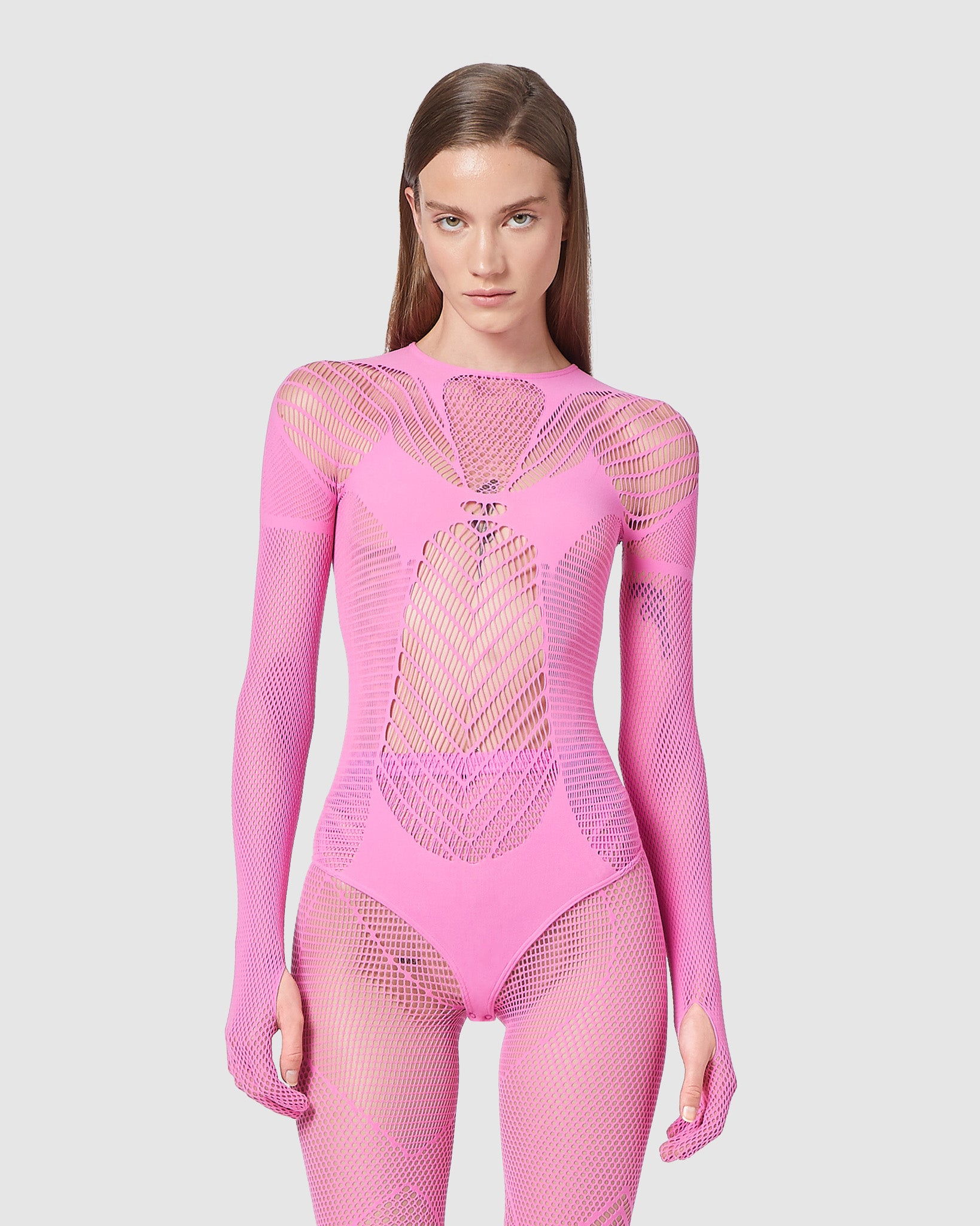 Venom fishnet bodysuit is designed for a close, figure-hugging fit. Perfect for releasing and supporting your natural curves, it features a mesh construction and long sleeves with thumbholes.